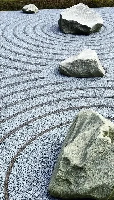 Сухой пейзаж, акцент на камнях и песке, медитативная функция.