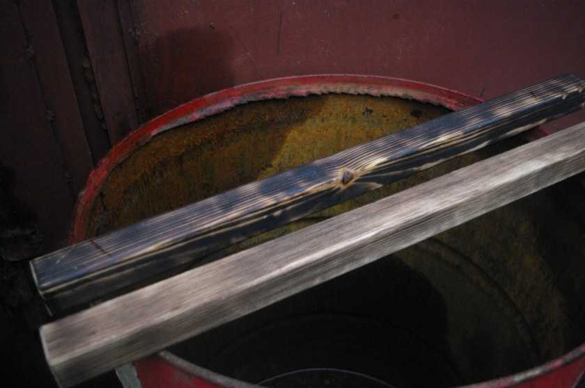 Предварительное опаливание позволяет прижечь наружный мягкий слой и одновременно тонировать древесину.