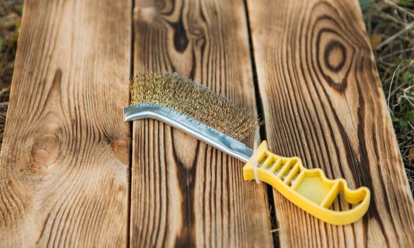 Способ также предусматривает использование металлической щетки или болгарки с проволочной насадкой. Сделать такое браширование древесины — нехитрый процесс.