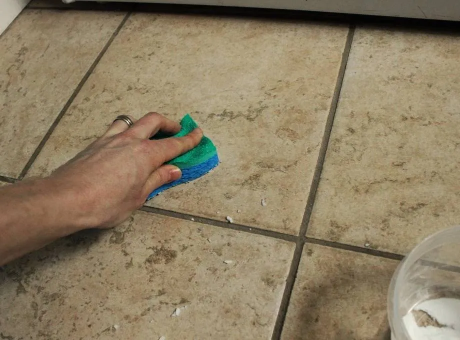 Даем возможность затирке в швах схватиться. Оценить готовность можно с помощью губки: намочим ее как можно сильнее и протестируем маленький участок. Если за губкой тянется затирка из швов, значит, она схватилась недостаточно. Подождите несколько минут и проверьте снова. Влажную очистку можно начинать тогда, когда затирка в швах остается на месте. Но она не должна быть твердой — иначе при очистке можно повредить швы.