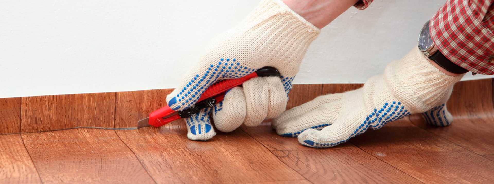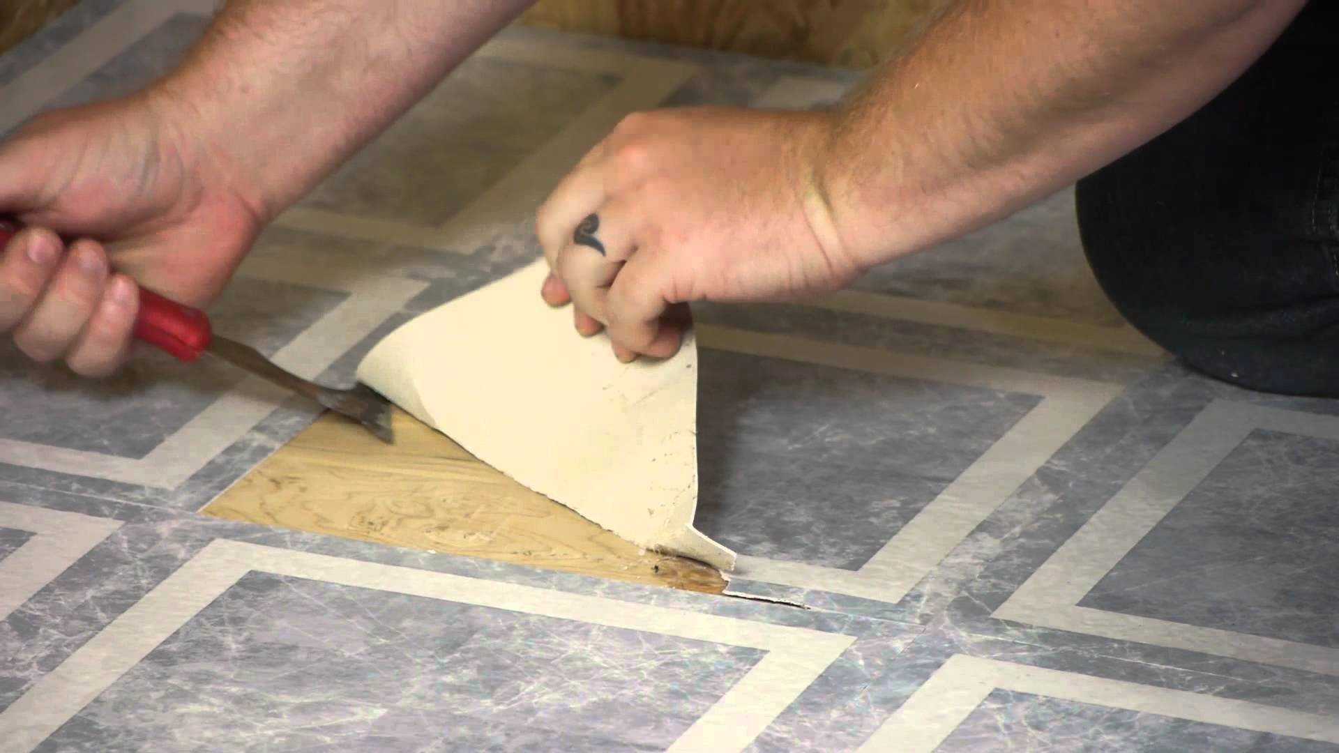 - аккуратно откройте разрез с помощь подрезания клеевой основы и шпателем удалите его остатки с пола и нижней части линолеума;