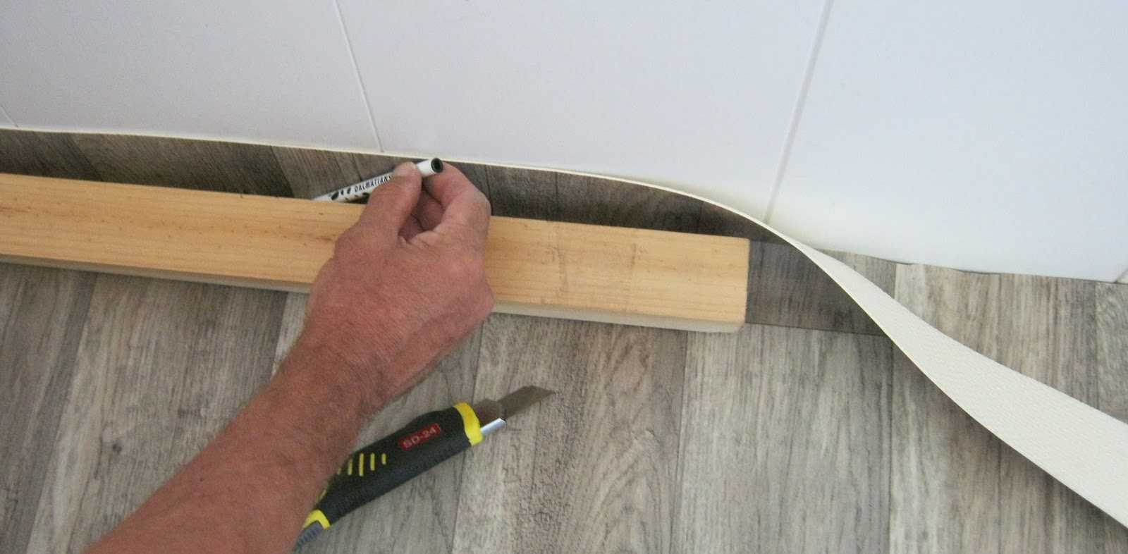 - если мебель не передвигали, то возможной причиной вздутия линолеума может стать неправильно подобранный его размер по площади помещения – снимите ближайший плинтус и убедитесь, что между стеной и краем линолеума есть зазор в 5-10 мм (если его нет, обрежьте небольшую кромку, а затем разровняйте пузырь от центра в сторону снятого плинтуса);