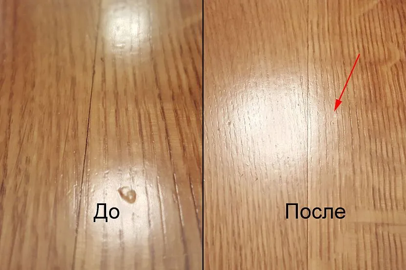Способ 1. Линолеум – это искусственный материал, изготовляемый из ПВХ (полихлорвинила) и, как все такие изделия, от нагревания сжимается. Тут есть большое НО! Чуть не угадаете с температурой – и всё. Вместо не очень заметного пузыря появится очень заметное расплавленное пятно. Но если вы всё-таки хотите попробовать – следуйте нашему совету.