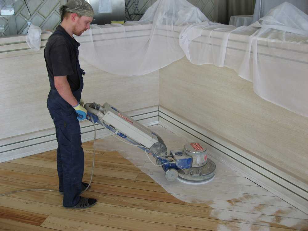Когда применяется профессиональная циклевочная машина, пол около стен шлифуют вручную, но важен нажим на инструмент.