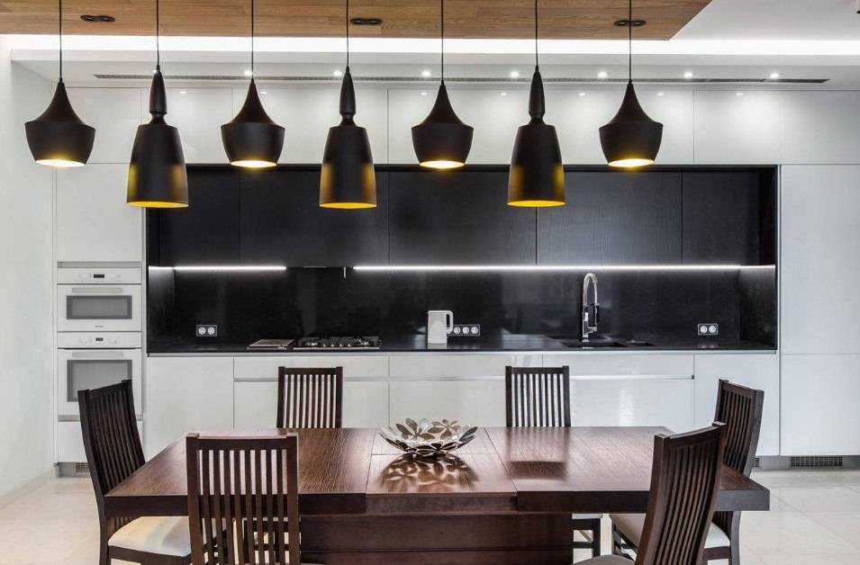 Обычно подсветку комбинируют с другими источниками света. Для одноуровневых натяжных потолков чаще всего используют подвесные люстры или плафоны. Очень интересно выглядит люстра с блестящими элементами в сочетании с глянцевым покрытием. Фото эффектных бликов на глянцевой поверхности одноуровневого натяжного потолка дает представление о необычном эффекте, украшающем ровное однотонное полотнище.