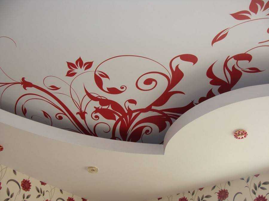 рисунок – точнее говоря, условное или абстрактное изображение, например, букет цветов, чашка кофе, затейливая красочная виньетка. Такой декор удобен тем, что позволяет зонировать комнату, так как собственно изображение занимает не весь потолок, а лишь какую-то его часть
