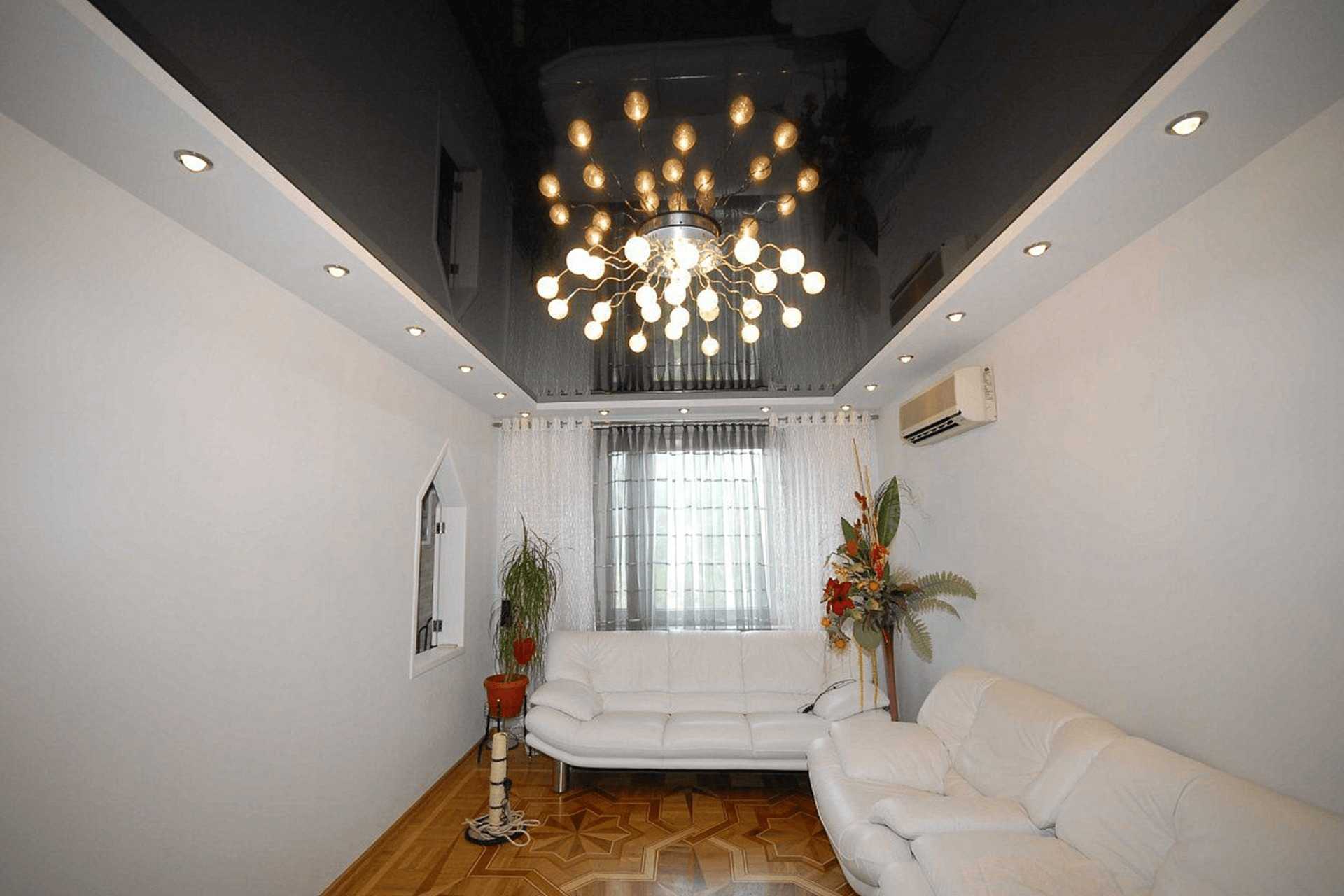 - черный натяжной потолок в зале – весьма эффектное решение. Глянцевый блеск пленочного полотна выполняет ту же функцию, что и при белом цвете, то есть обеспечивает отличное освещение и зрительно увеличивает комнату. При этом черный цвет не делает помещение мрачным, а наоборот придает ему необыкновенную элегантность. Фото черного натяжного потолка в зале могут служить примером интерьерной моды;