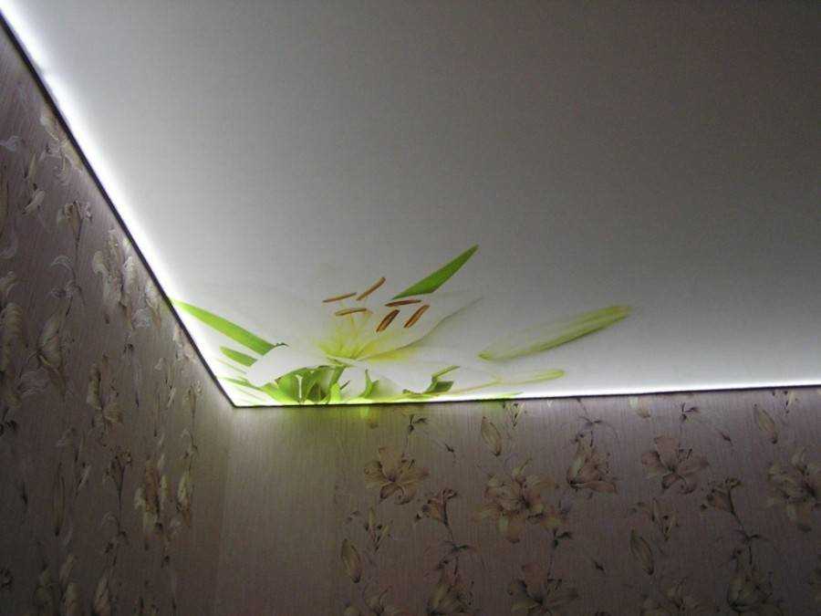 - «Внутренний» свет. Такой эффект возможен только с полупрозрачной пленкой. Светодиодную подсветку монтируют прямо на плите перекрытия с помощью специальных панелей. Сверху натягивают полупрозрачную пленку. Возникает ощущение внутреннего свечения. Особенно эффектно такой вариант выглядит с полотном, украшенным рисунком или фотографией.