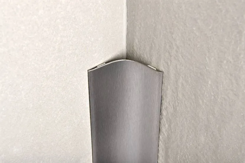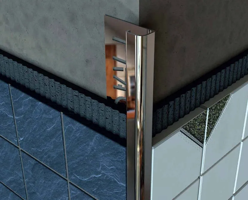 Плитка . Соединения или плинтуса для кафеля обычно имеют специальный выступ, устанавливаемый под плитку, за счет чего декор угла крепко держится на месте. Также существуют металлические внешние детали разных размеров для отделки углов, их клеят на эпоксидный, полиуретановый клей.