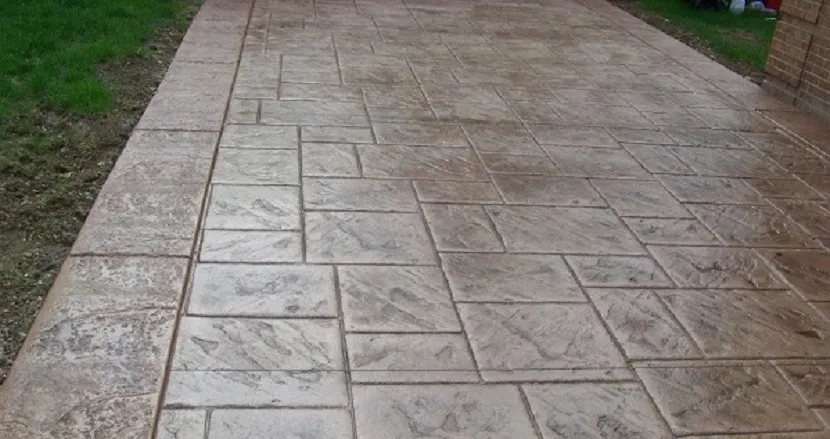 Такой вариант делается на свежезалитой поверхности монолитной бетонной дорожки. Применив специальную форму-штамп, вы достигнете красивого результата. Принцип заключается в отпечатывании фактуры в незатвердевшем бетоне. После удаления форм останется незамысловатый рисунок.