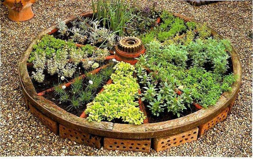 Бывшее колесо от телеги может стать шикарной круглой грядкой с отдельными сегментами для каждого растения.