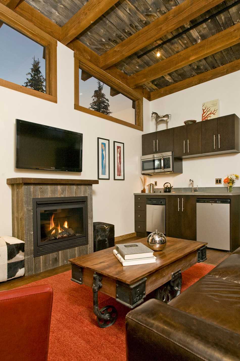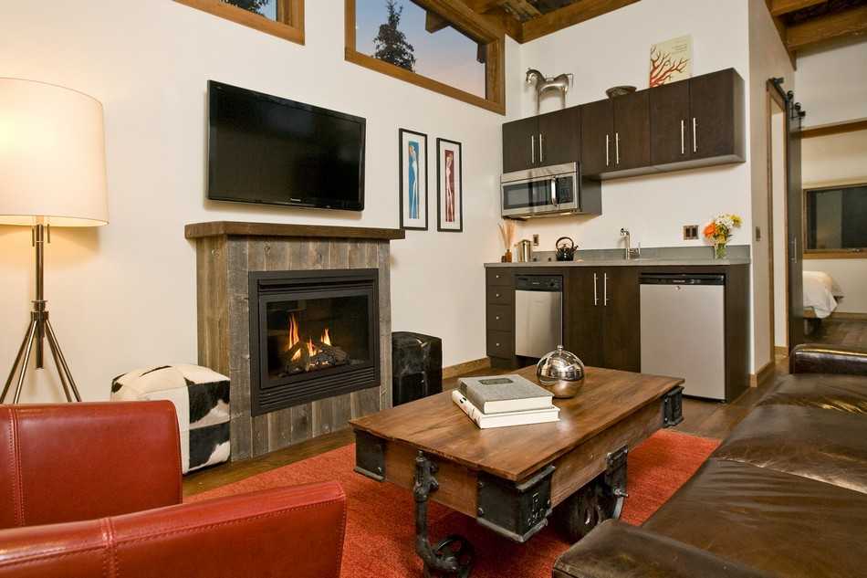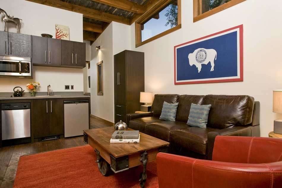 Антураж интерьера в стиле шале поддерживает кожаная мебель, домотканые ковры, светильники из грубо обработанного металла. Несмотря на обилие “брутальных” элементов, обстановка выглядит домашней.