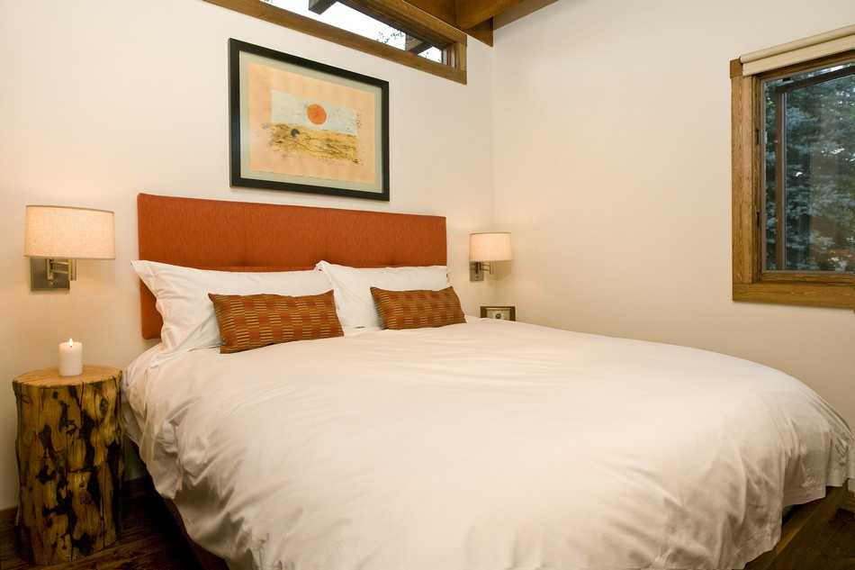Дизайнеры постарались использовать как можно больше природных материалов, например, в качестве прикроватных тумбочек поставили деревянные пни со свечами, которые смотрятся очень стильно и гармонично.
