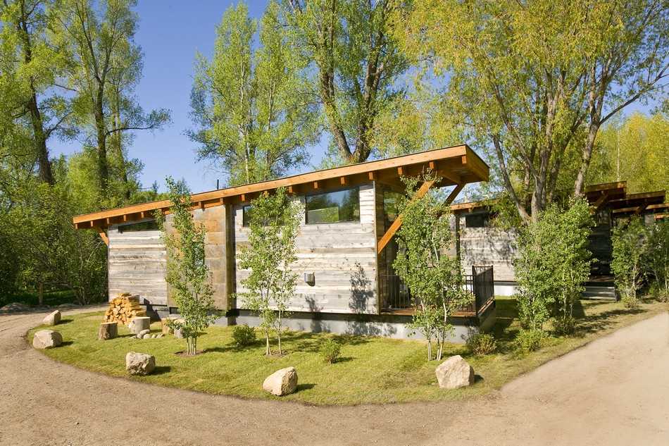 Ещё одна компактная жилая постройка в лесу, хозяин которой ценит уединение и красоту природы. Бывший рыбацкий дом стоит на берегу озера, за которым можно наблюдать в любое время года — одна стена дома полностью стеклянная. Общая площадь — 43 кв. м.